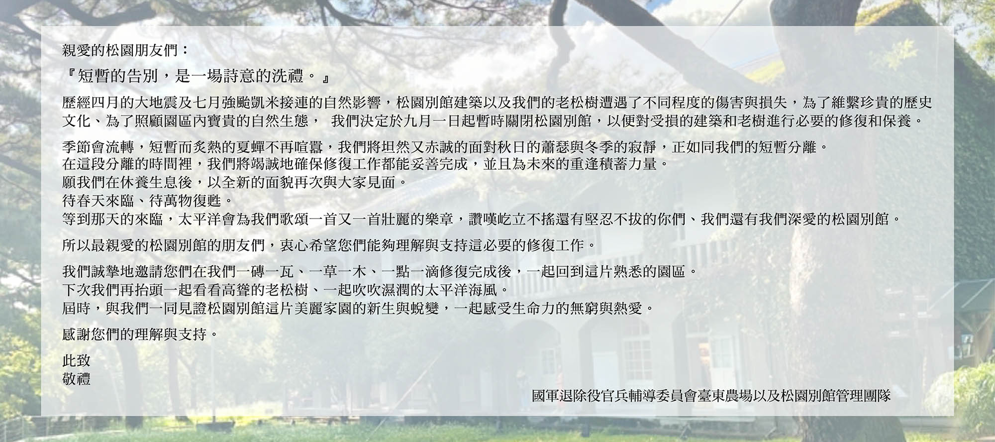 訊息內容因松園別館自113年9月1日起暫時關閉,台灣好行-縱谷花蓮線303C:【松園別館】站點變更為【將軍府1936園區】。 ▲松園別館暫時關閉說明 ※詳細資訊可至🔗松園別館官網 🔗台灣好行-縱谷花蓮線303C 🔗太魯閣客運facebook粉絲專頁👈查詢相關照片