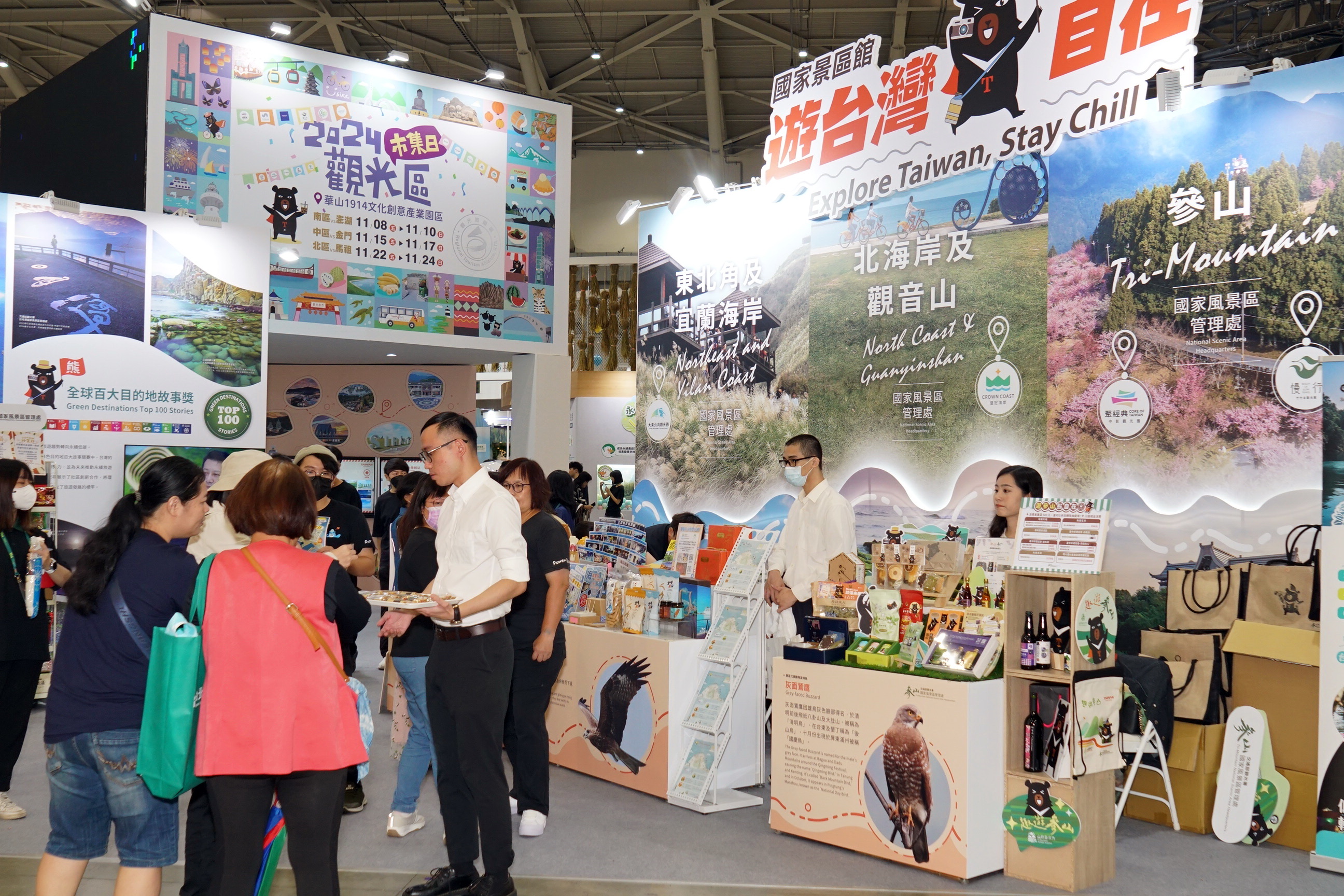 各觀光圈業者結合永續理念展售相關產品,包含新成立的金門觀光圈,將由各管理處連結食宿遊購行等觀光業者,持續推動國際觀光品牌,並以高品質且活力十足的遊憩服務,迎接世界各地來訪的遊客。同時為宣傳及響應全球永續議題的浪潮,展期間也透過舞台活動、2023-2024全球百大目的地永續故事獎展示區等,揭露綠色旅遊的重要性,邀請民眾可以在規劃旅途時,透過尊重在地文化、愛護自然環境、回饋在地理念等永續作為,以實際行動支持永續旅遊。