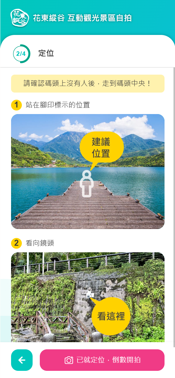 自拍系統操作流程簡單、快速且直覺,遊客只要在鯉魚潭潭南碼頭掃描現地導覽牌上的QR Code,便可進入自拍系統操作介面,遵循系統的語音指引(支援中、英、日文等3種語言),選擇自己偏好的鏡頭視角(特寫景緻或遠景構圖)完成拍攝(每次操作有2次拍攝機會),還可透過簡單易用的影像編輯功能自行於照片中添加花東縱谷特色相框後,一鍵下載或分享,讓遊客於拍下獨一無二畫面的同時,能立即在社群媒體分享自己的新鮮體驗!另外,配合自拍系統啟用,縱管處特別於花東縱谷Facebook專頁推出限時贈獎活動,即日起至114年1月31日止,民眾只需於指定貼文中留言回答相關問題,並標註好友,即有機會獲得花東縱谷精美小禮一份。後續亦將推出現地自拍打卡活動,敬請期待並持續關注縱管處官網及粉絲專頁,以獲得最新活動資訊!