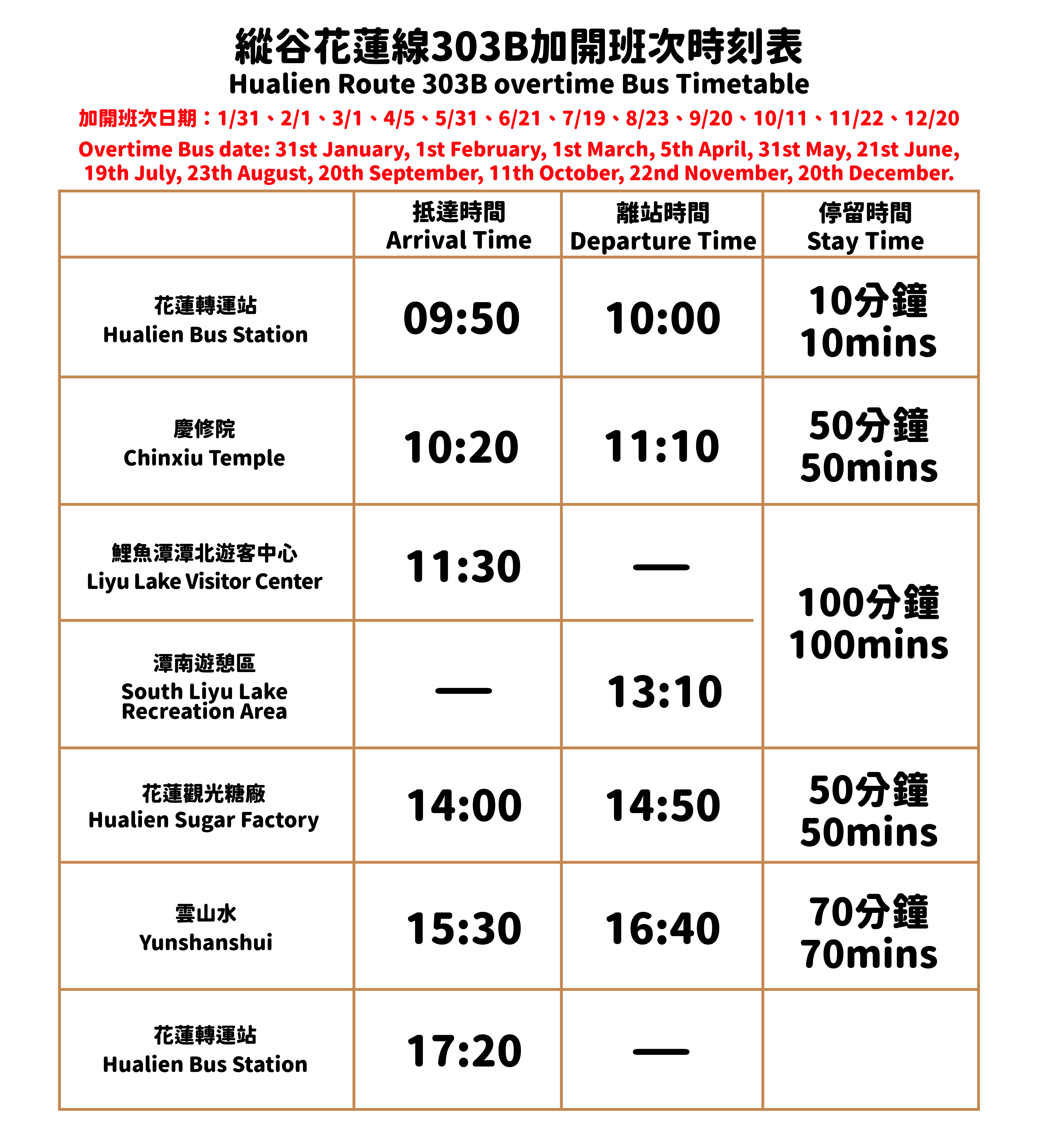 訊息內容台灣好行縱谷花蓮線為優化服務,因應遊客需求,114年特於1月31日、2月1日、3月1日、4月5日、5月31日、6月21日、7月19日、8月23日、9月20日、10月11日、11月22日、12月20日,增開去回程各1班次,發車時間不變,敬請多加利用😉 相關照片
