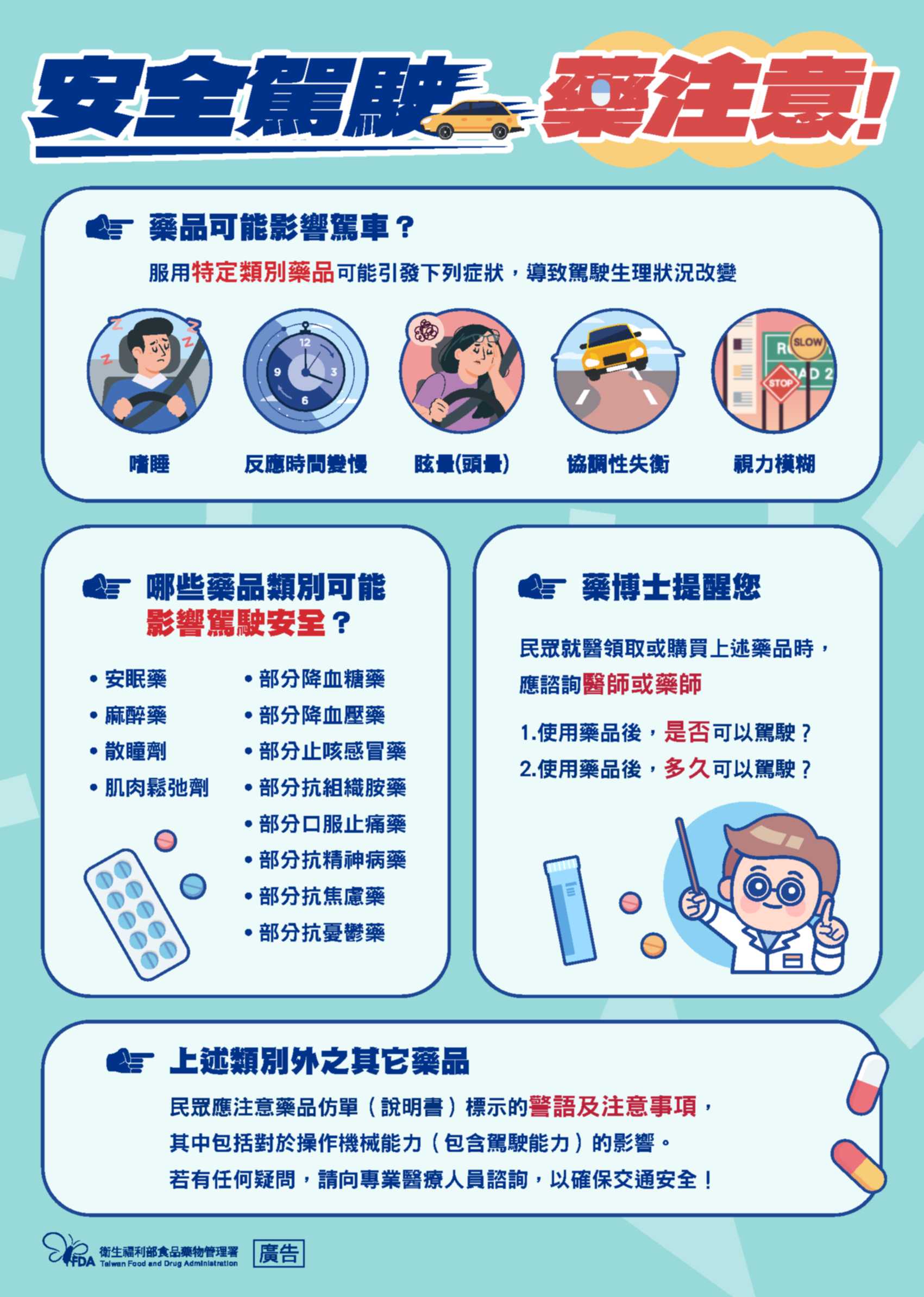 安全駕駛 藥注意!(圖:衛生福利部食品藥物管理署製)(.pdf)