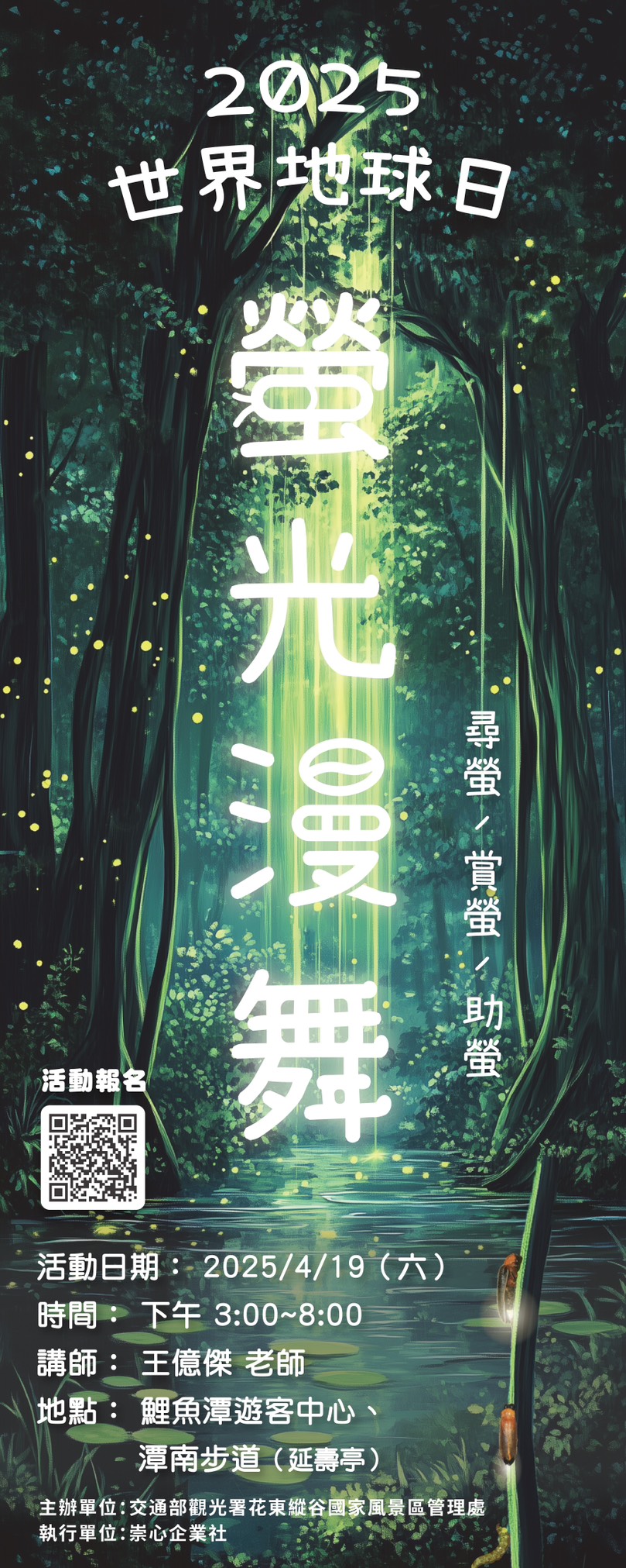 4月22日世界地球日是全球最盛大的環境節日,旨在喚起大眾對於環境保護的意識及關注,縱管處為共同響應並推廣環境教育,本次於114年4月19日(星期六)舉辦「螢光漫舞」生態講座,邀請民眾共同探索螢火蟲的奧秘,思考螢火蟲與生態環境的關聯。