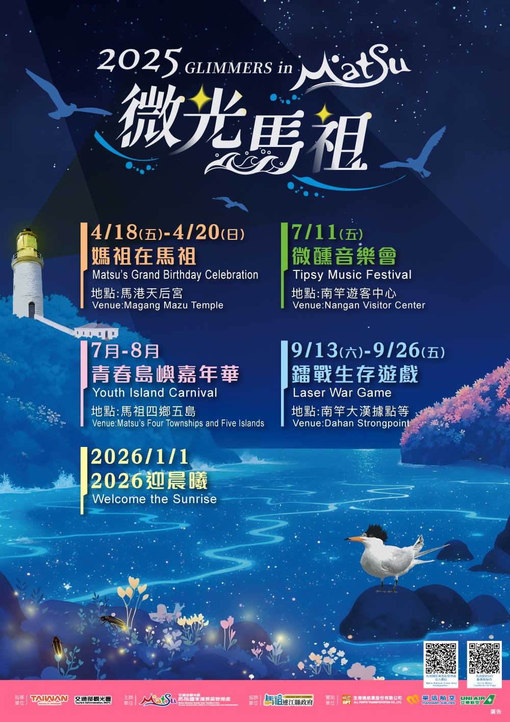 訊息內容馬祖具有多元觀光資源,交通部觀光署馬祖國家風景區管理處(下稱馬管處)希冀藉由「2025微光馬祖系列活動」系列活動,結合戰地風光、閩東文化、生態景觀等,吸引國內外旅客來馬旅遊;本活動推廣「微光馬祖」品牌,推出媽祖在馬祖、微醺音樂會、青春島嶼嘉年華、鐳戰生存遊戲等主題活動,打造馬祖旅遊觀光魅力。 ※活動詳情資訊請至馬管處Facebook粉絲專頁「馬祖愛趴GO」(👈點我)查詢。 相關連結馬管處Facebook粉絲專頁「馬祖愛趴GO」相關照片