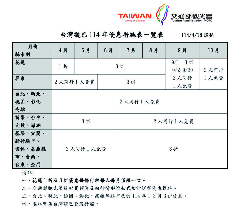 交通部觀光署為提振國民旅遊市場,114年推出「台灣觀巴」1月1日至10月31日2人同行1人免費,配合「台灣觀光100亮點」環島月月PARTY主軸活動之輪值縣市,按季加碼為3折優惠,深獲各界迴響。