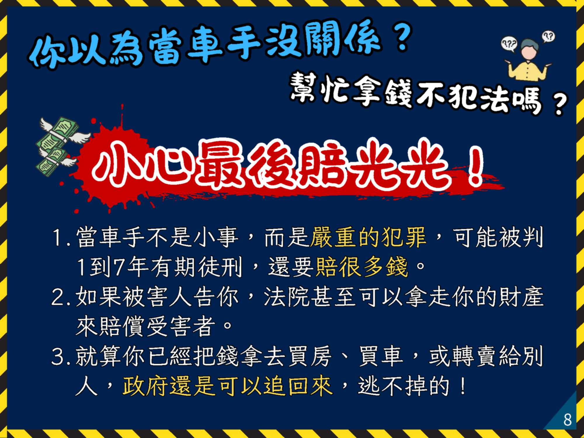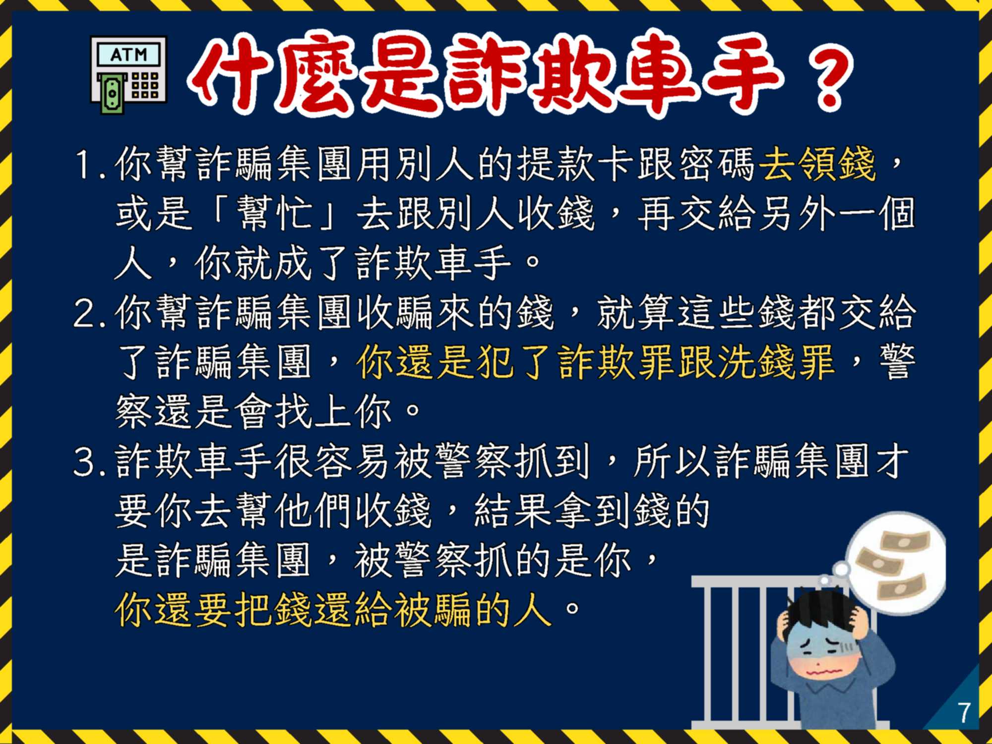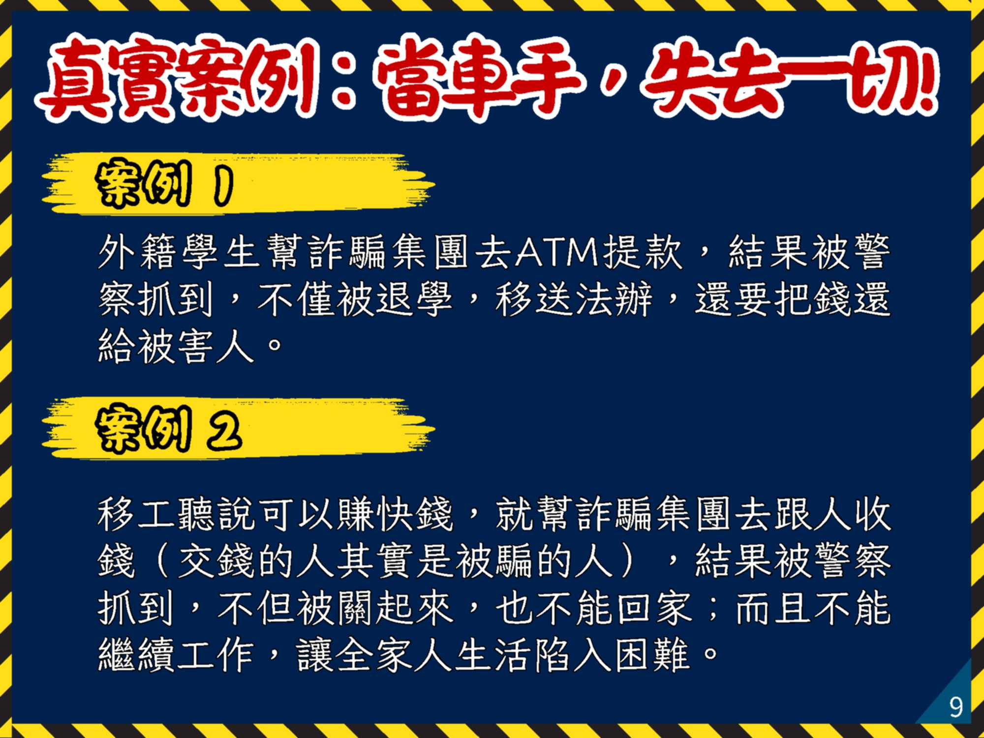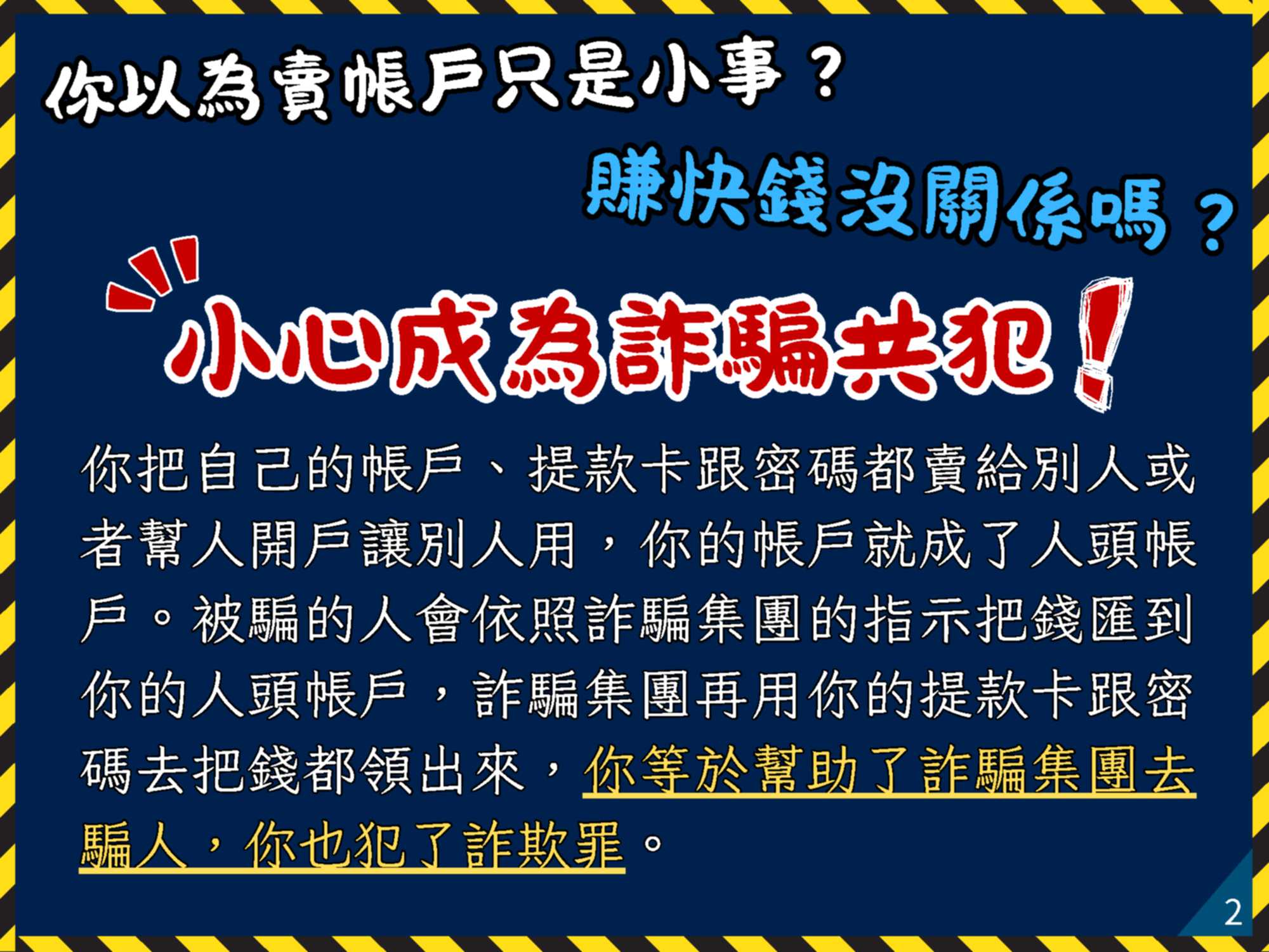 訊息內容「外籍人士反詐騙宣導簡報」-什麼是人頭帳戶? 附件檔案「外籍人士反詐騙宣導簡報」-什麼是人頭帳戶? (中文版)(.pdf)「外籍人士反詐騙宣導簡報」-什麼是人頭帳戶? (英文版)(.pdf)相關照片