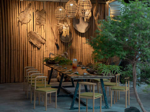 縱管處許宗民處長表示,在空間設計上,設計團隊將整體場域高度重新拉平,讓線條顯得更加簡潔俐落,視線得以穿透、流動,就像是布農族人的坦率與直接,也讓光影能自然地灑落在每一處,硬體的改造核心則為全新的燻烤室、爐灶與工作吧台,讓烹飪環境更加完善,產出更美味的佳餚,另用餐區域則聚焦在狩獵元素與小米、玉米等布農族常見穀物,如布農族傳統編織文化般打造精緻餐食空間,包含木質桌椅、竹牆上張掛的獸皮,映著溫暖燈光的藤編燈籠,處處流露著來自布農族的呼喚,讓遊客從坐下來的那刻起,彷彿就與山林、祖靈以及過去的記憶產生連結。