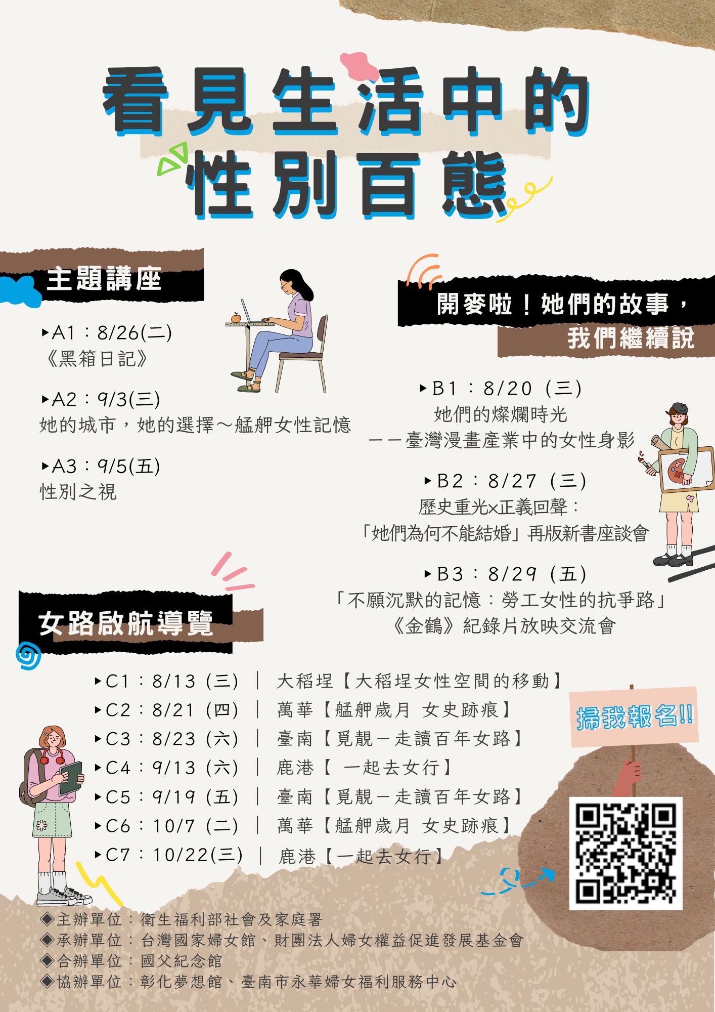 旨揭系列活動於114年8月至10月間,與國立國父紀念館、彰化夢想館及臺南市永華婦女福利服務中心等單位合作,在北部、中部及南部均有辦理,歡迎民眾踴躍參與,以提升性別平權意識。