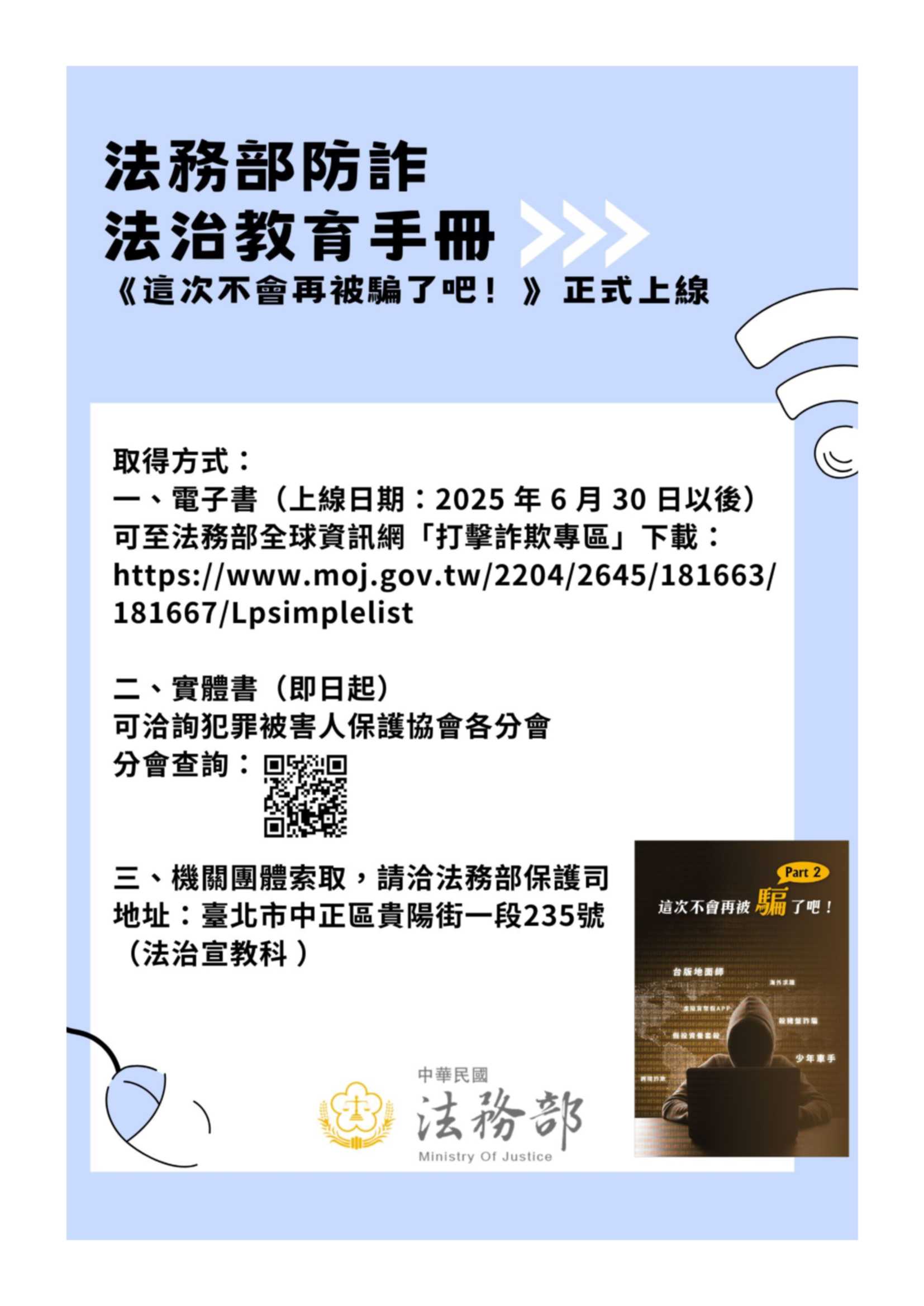 法務部製作之詐欺防制法治教育手冊(這次不會再被騙了吧!)(.pdf)