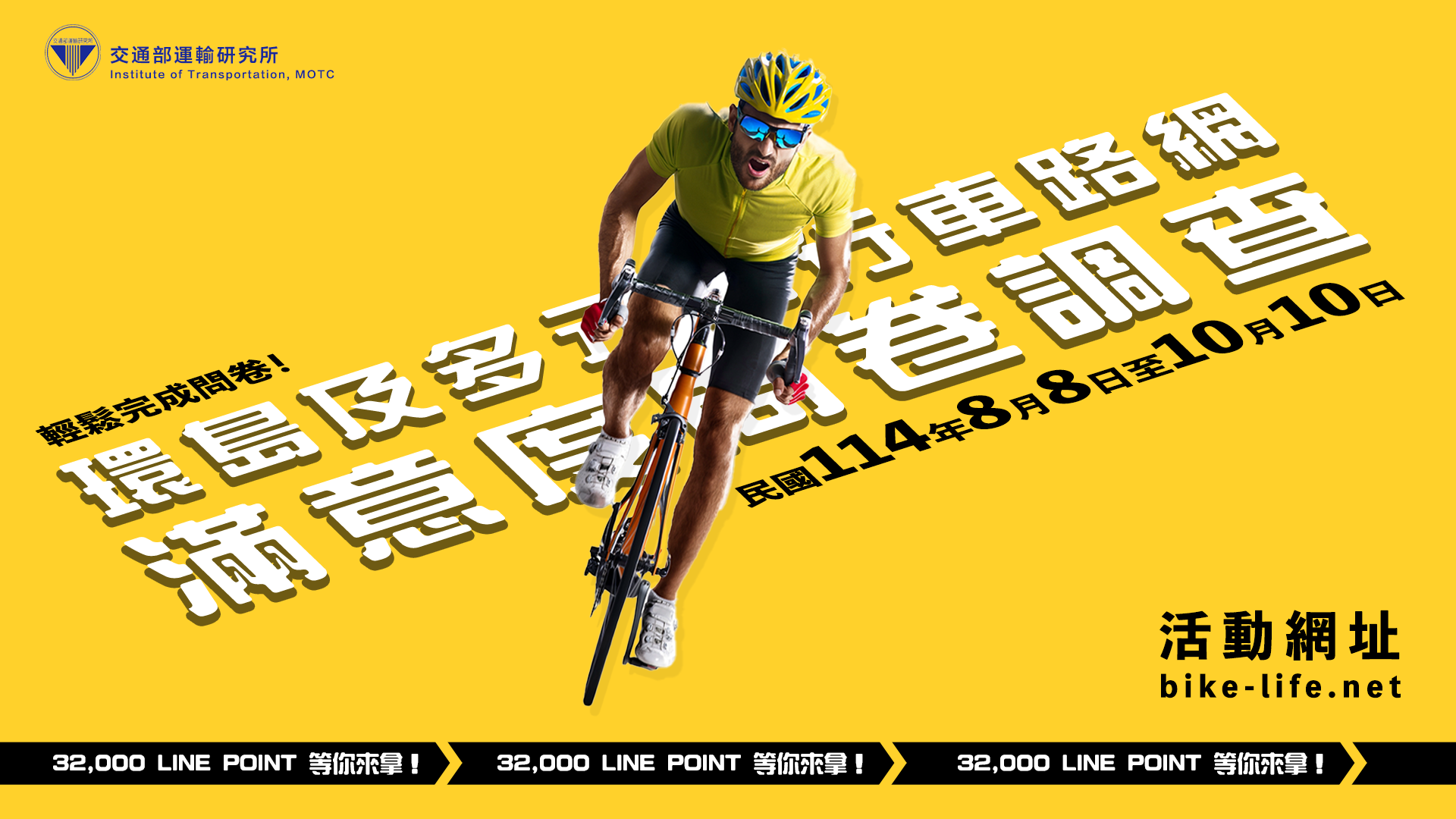訊息內容交通部運輸研究所(下稱運研所)為瞭解自行車騎士對於交通部推動環島及多元自行車路線之滿意度,運研所於114年配合「自行車路網整併暨第二條環島路線規劃」成果,就保留之編號路線辦理「環島及多元自行車路網滿意度問卷」調查,以利提出後續年度之自行車路線優化建議事項。 為擴大蒐集自行車友之意見,運研所製作「環島及多元自行車路網滿意度問卷」電子宣傳文宣(問卷網址 👈請點我),請所有自行車友於網路上填答,回饋實地騎乘之體驗。😉相關連結問卷網址相關照片