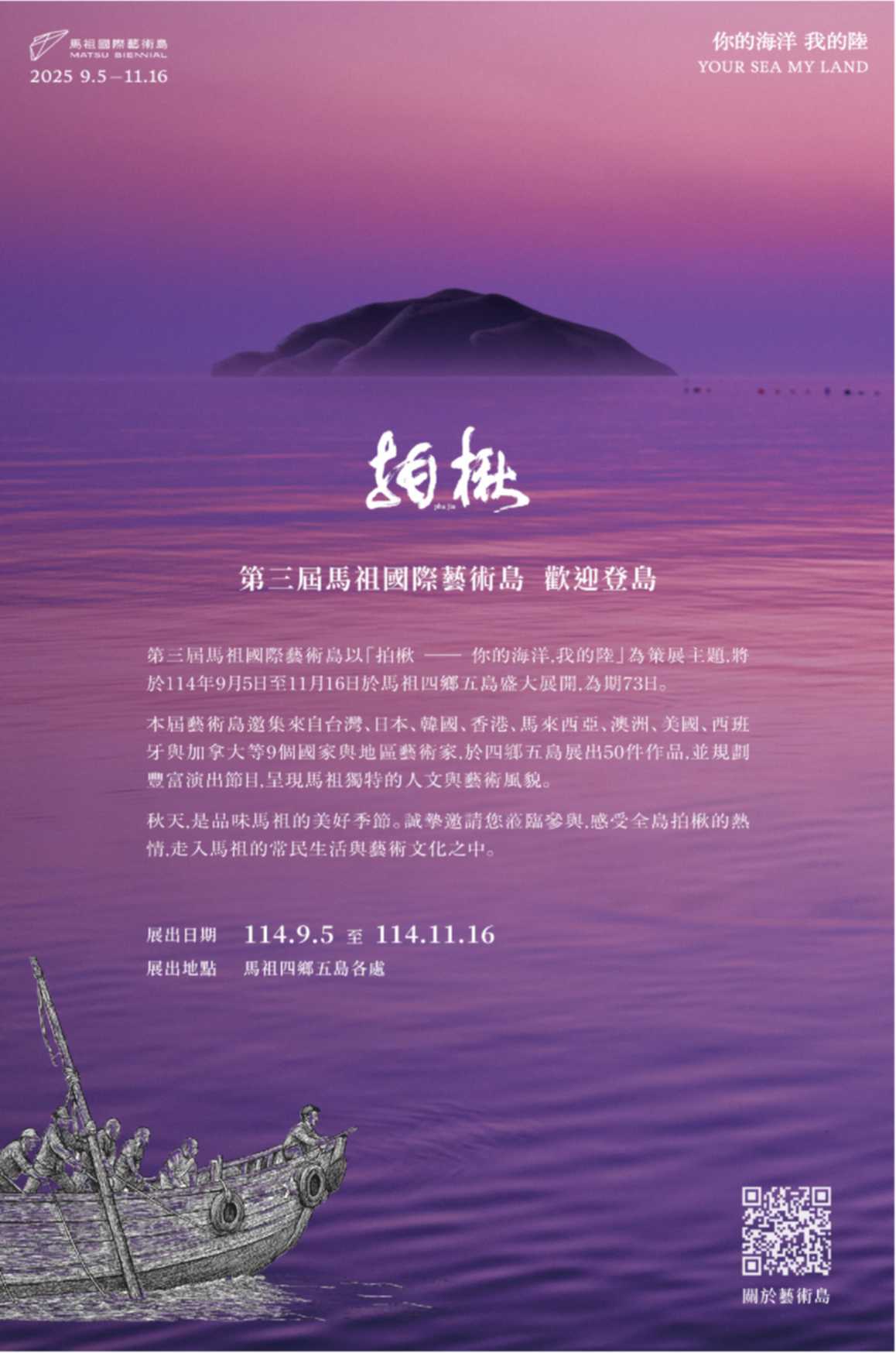 訊息內容連江縣政府主辦之「第三屆馬祖國際藝術島」活動,以「拍楸-你的海洋,我的陸」為策展主題,邀集來自台灣、日本、韓國、香港、馬來西亞、澳洲、美國、西班牙與加拿大等9個國家與地區藝術家,於馬祖展出50件作品,並規劃相關表演節目,呈現馬祖獨特的人文與藝術風貌,活動資訊如下:日期:114年9月5日至11月16日。地點:馬祖四鄉五島各處。活動詳請參閱🔗官網 👈附件檔案「第三屆馬祖國際藝術島」活動海報(.pdf)「第三屆馬祖國際藝術島」活動回執單(.pdf)相關連結活動官網相關照片