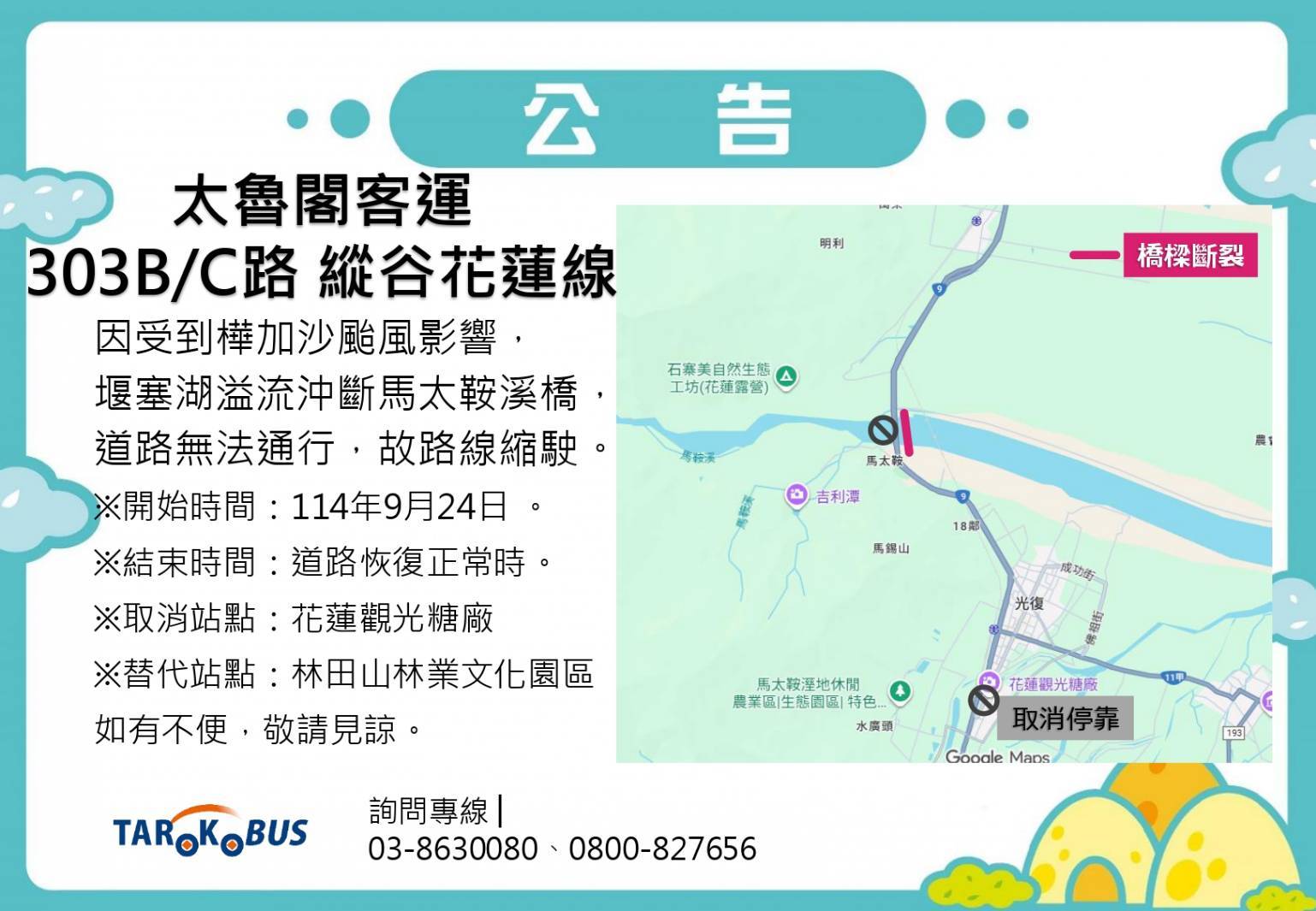 因樺加沙颱風帶來致災性豪雨,造成馬太鞍溪上游堰塞湖潰堤,洪水沖毀了馬太鞍溪橋,導致該路段交通完全中斷。為確保乘客安全,「303B/C路 縱谷花蓮線」將自即日起縮短行駛路線並調整停靠站點。