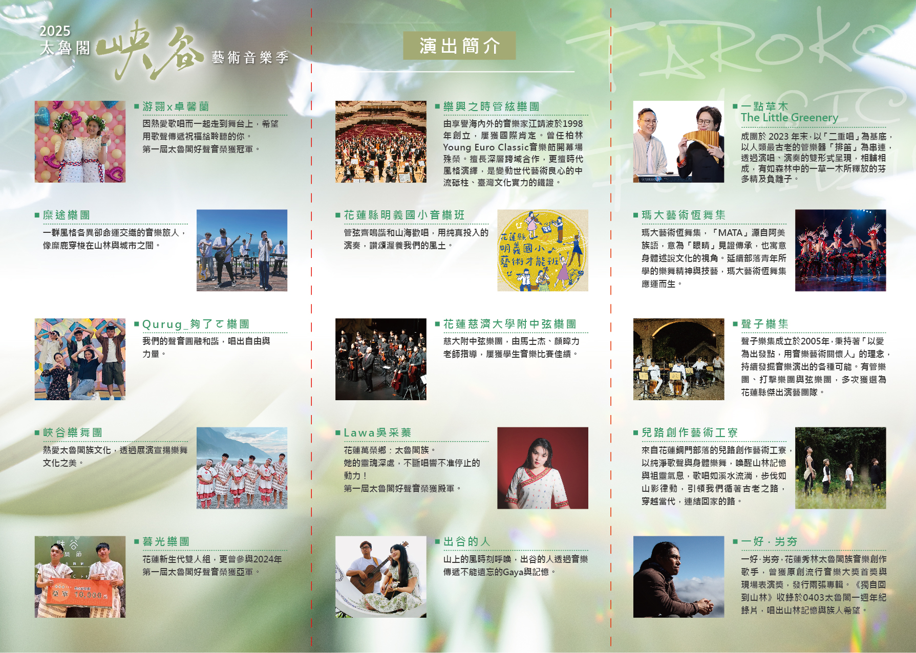 以下資訊擷自內政部國家公園署太魯閣國家公園管理處全球資訊網> 最新消息> 2025太魯閣峽谷藝術音樂季 悸動秋鳴圓滿落幕 期待10月冬季原音鼓動👈詳細資訊請點我