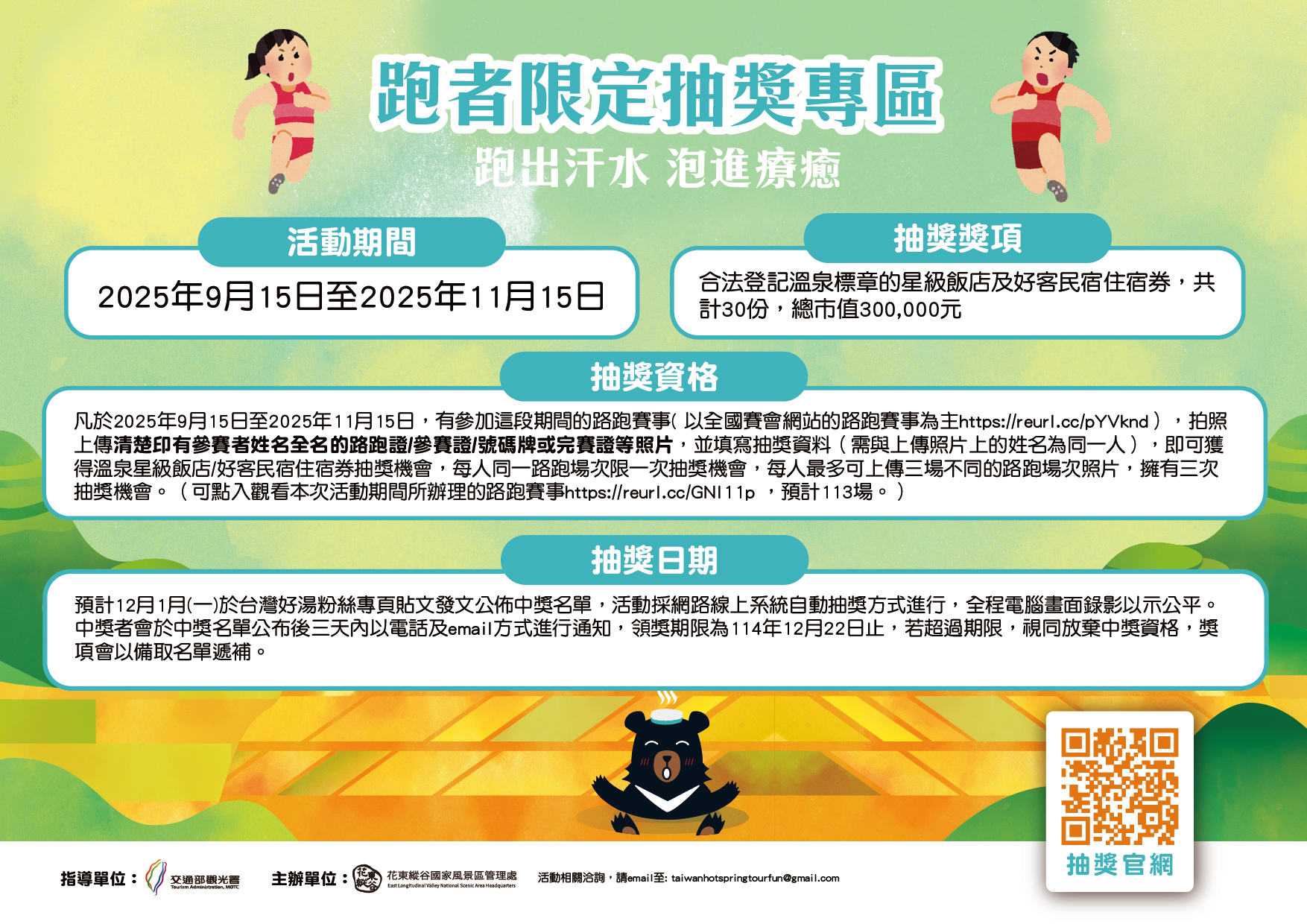 縱管處許宗民處長表示,這項專為跑者設計的「跑出汗水泡進療癒」抽獎活動,正是「2025-2026台灣好湯溫泉環島遊」系列活動中的「三重抽」亮點之一。活動期間鎖定在每年路跑賽事最密集的114年9月15日至114年11月15日期間,只要在這段時間內參加任何一場路跑賽事的跑者(賽事場次請參照:全國賽事 為準),前往「台灣好湯溫泉環島遊好禮三重抽」活動官網,在「跑者限定抽獎區」登錄參賽資料與證明,就有機會成為幸運兒,將星級溫泉住宿券帶回家,共計30名額,給熱血的跑者最直接的賽後療癒。