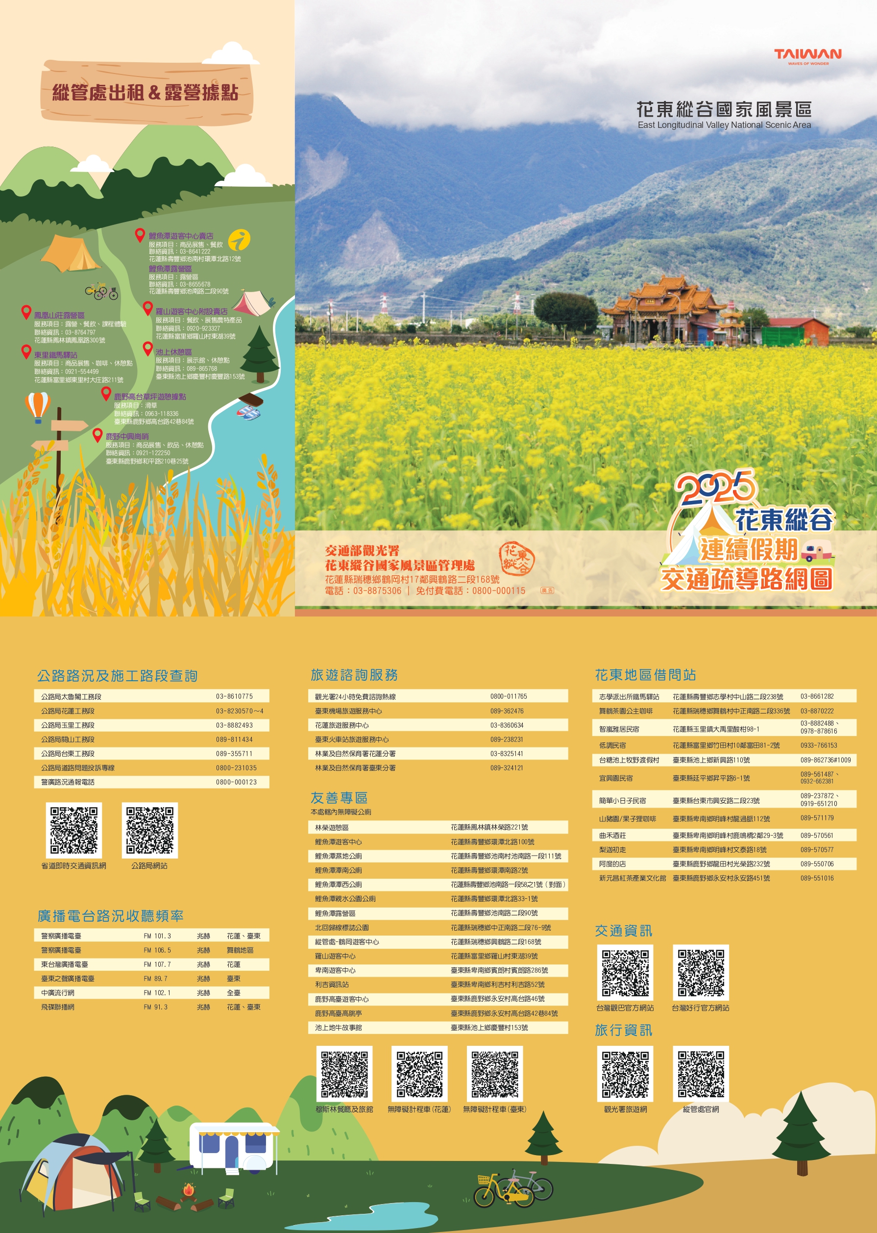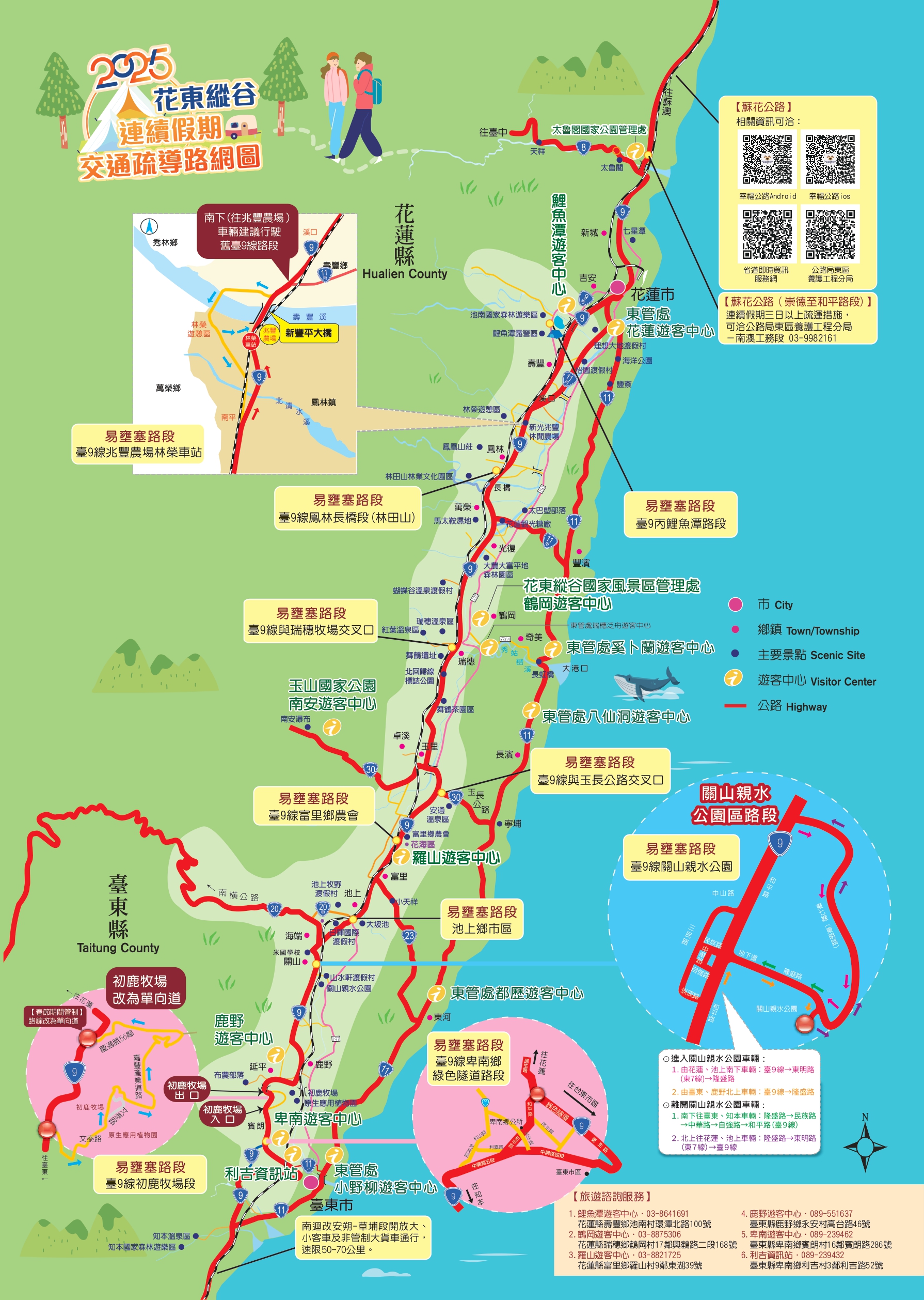另為提供旅客交通旅遊資訊所需,本處整合交通及旅遊相關資訊,製作「2025年花東縱谷連續假期交通疏導路網圖」電子版提供民眾下載使用。