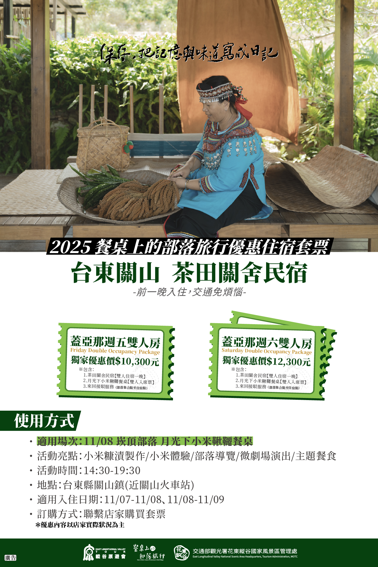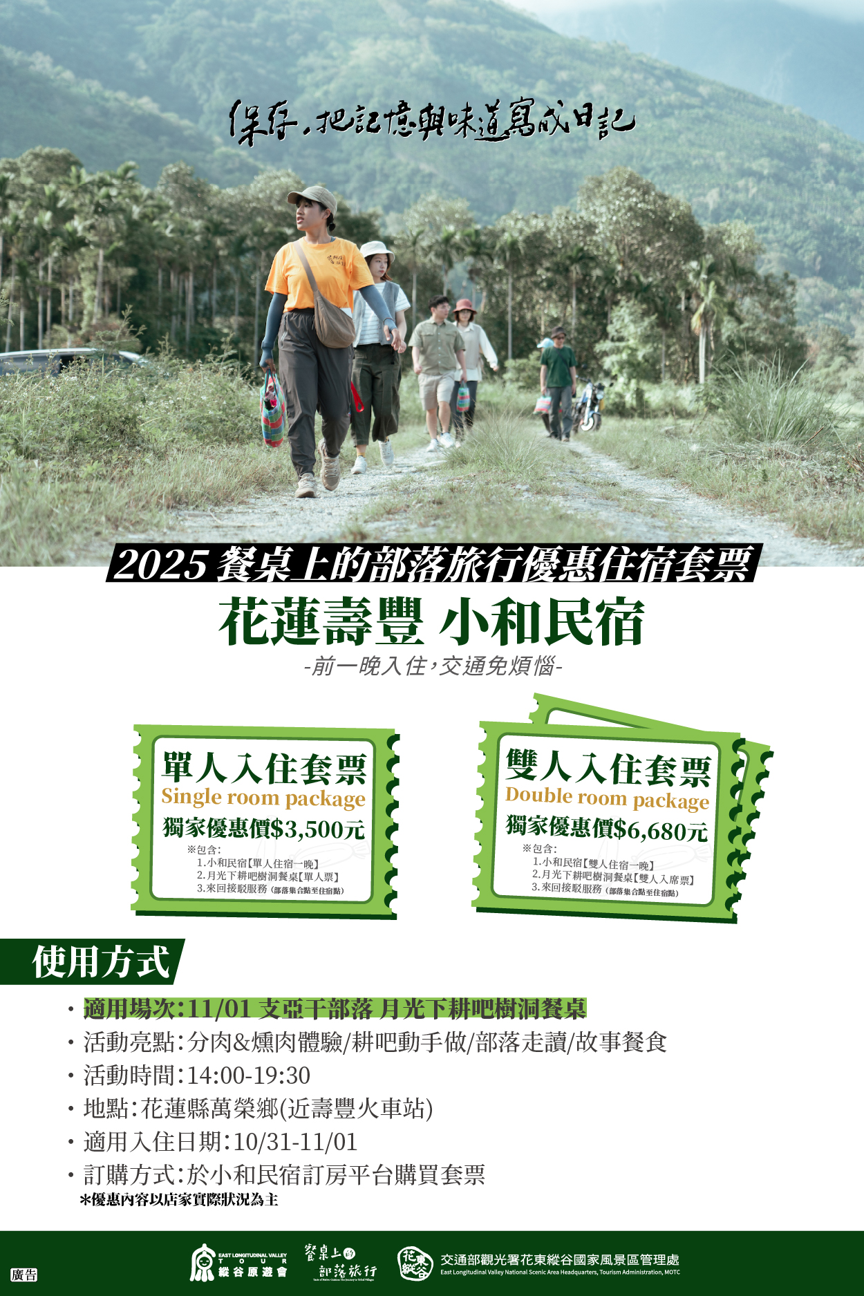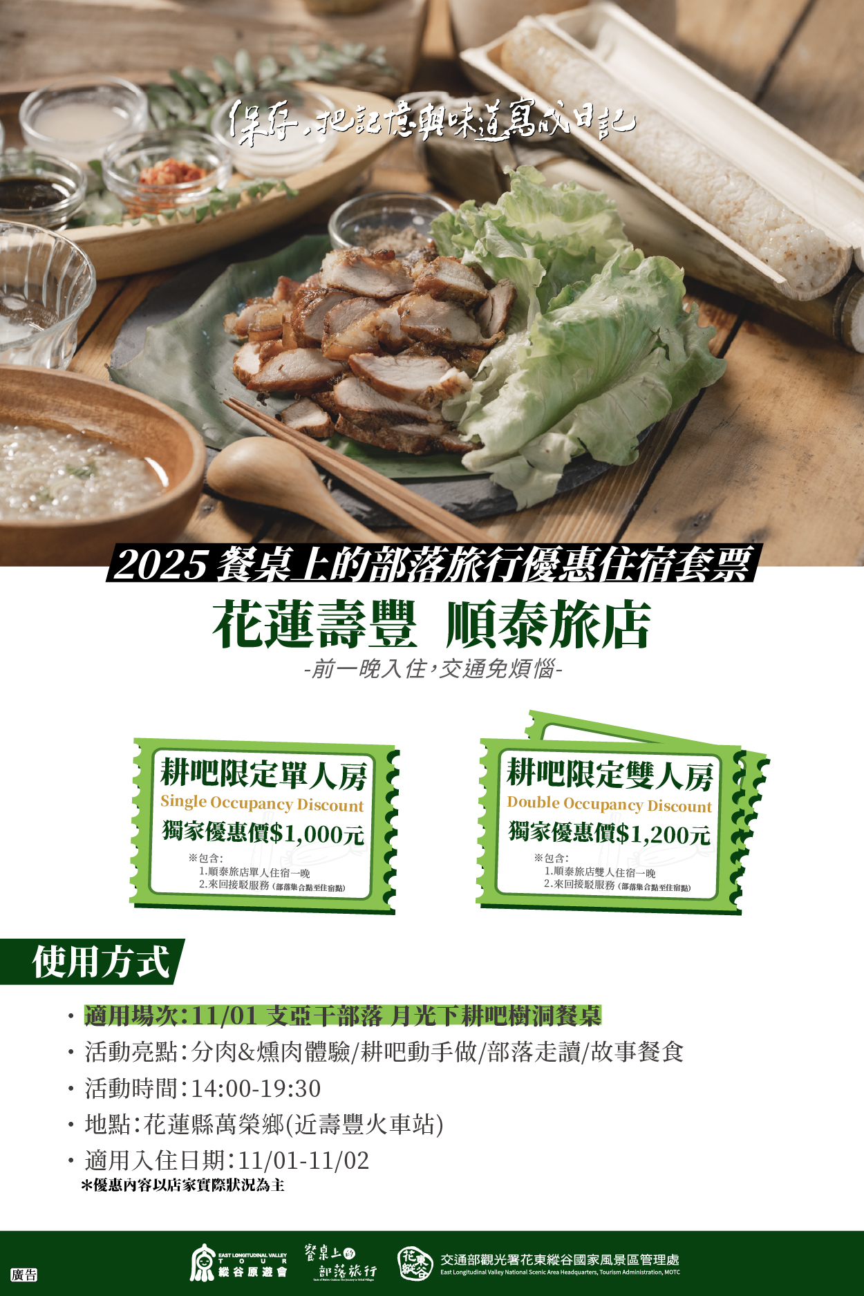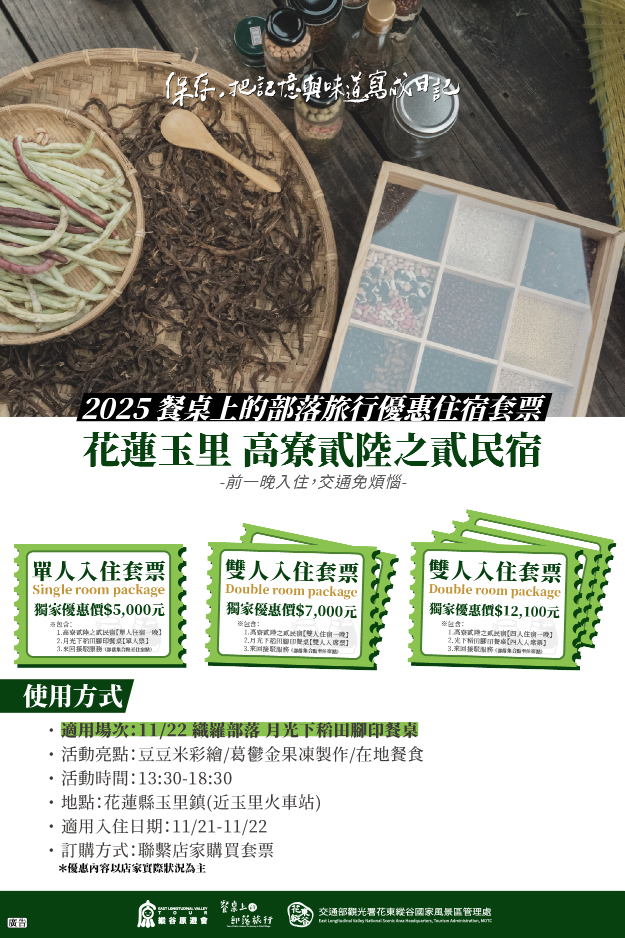 「縱谷原遊會—餐桌上的部落旅行」自辦理以來受到大家喜愛,許多朋友更不惜遠道前來參與。為了讓大家更便利享受旅程,今年特別與部落周邊四間民宿夥伴推出餐桌住宿套票,包含:「花蓮壽豐 小和民宿」(搭配支亞干部落場次)、「花蓮壽豐 順泰旅店」(搭配支亞干部落場次)、「台東關山 茶田關舍民宿」(搭配崁頂部落場次)、「花蓮玉里 高寮貳陸之貳民宿」(搭配織羅部落場次)。不論是自行前來、或是和家人、好友、伴侶同行,只要報名參與今年的部落餐桌遊程,可選擇搭配參與的場次民宿入住購入套票,並在活動期間提供住宿點至部落接駁服務,相關優惠資訊如下,更多活動報名詳情,亦可上活動官網查詢。