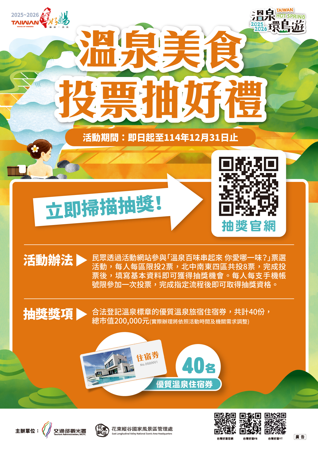 台灣好湯邀全民「吃好湯、抽好康」由花東縱谷國家風景區管理處辦理的「2025-2026台灣好湯 溫泉環島遊好禮三重抽」活動現正熱烈展開!其中最受民眾期待的「溫泉美食投票抽好禮」已於 2025 年 11 月 5 日起熱鬧登場,只要動動手指,就能為你心中最愛的溫泉美食投票,還有總值 20 萬合法溫泉標章旅宿的優質住宿券等你抽。