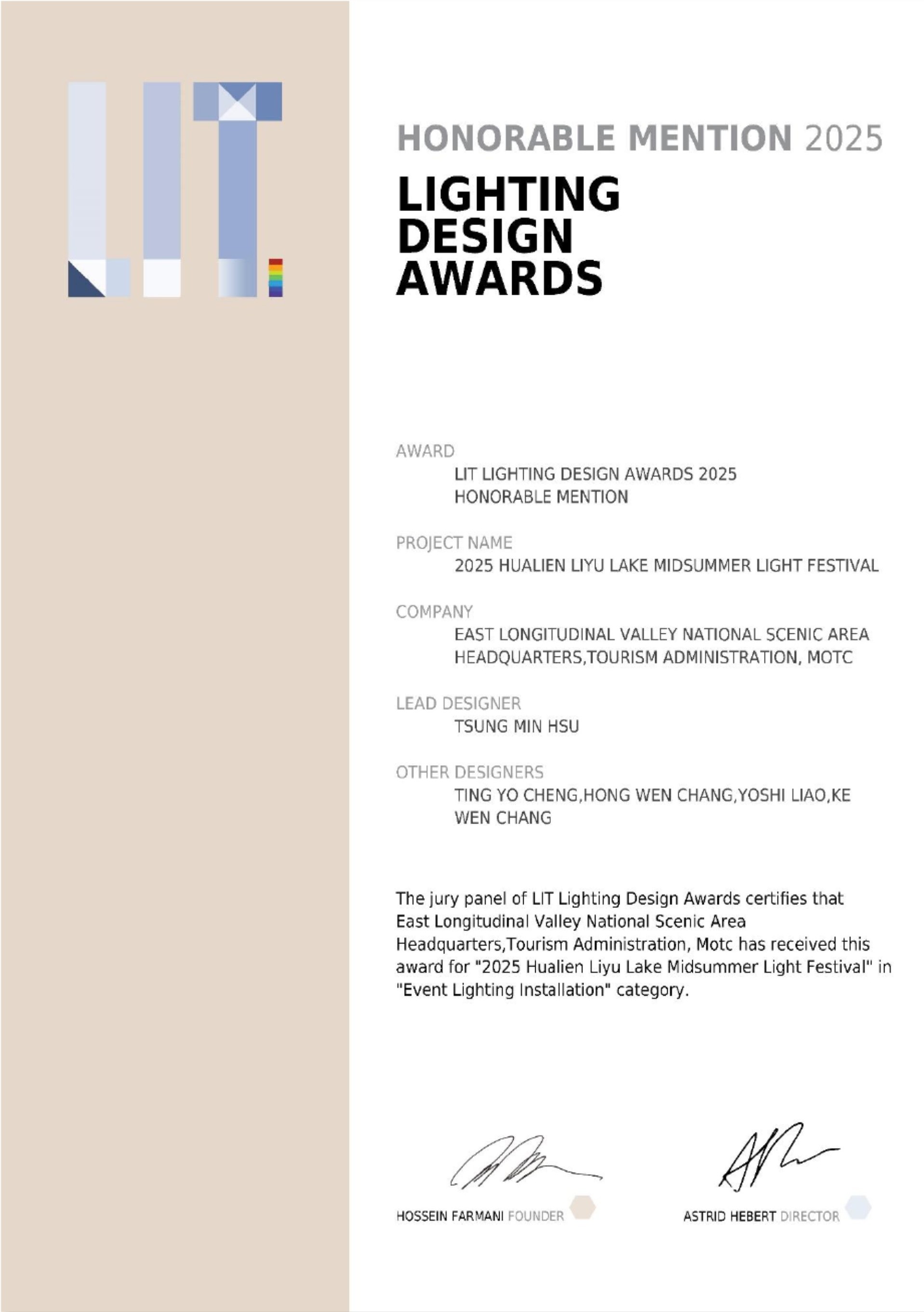 LIT 照明設計獎為全球照明設計領域最具權威的獎項之一,2025年吸引62國、逾千件作品參賽,競爭激烈。本次鯉魚潭光影節以融合自然、文化與科技的光環境設計,在眾多國際作品中脫穎而出,獲得優選獎(Honorable Mention),展現台灣夜間光環境設計的國際水準。