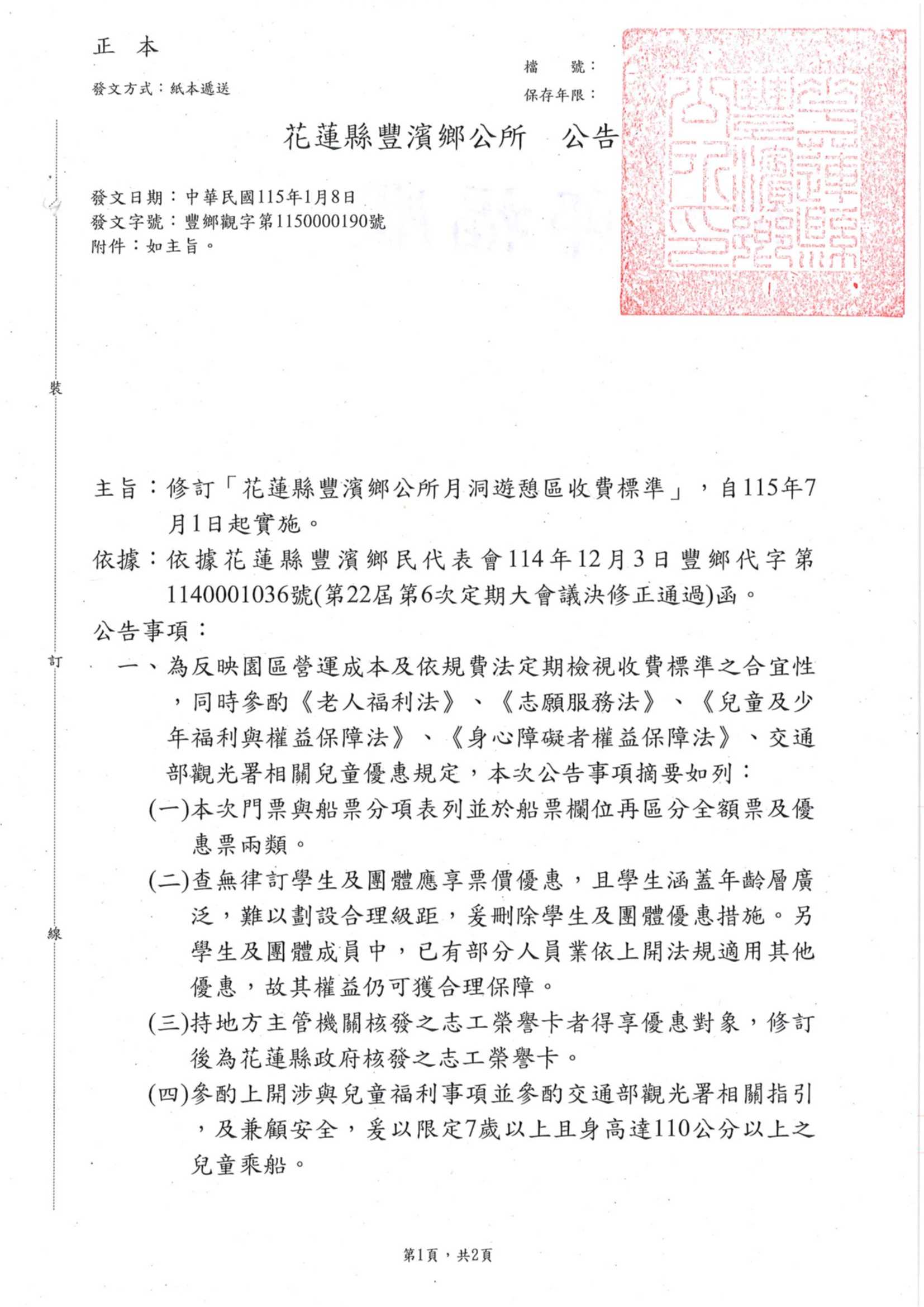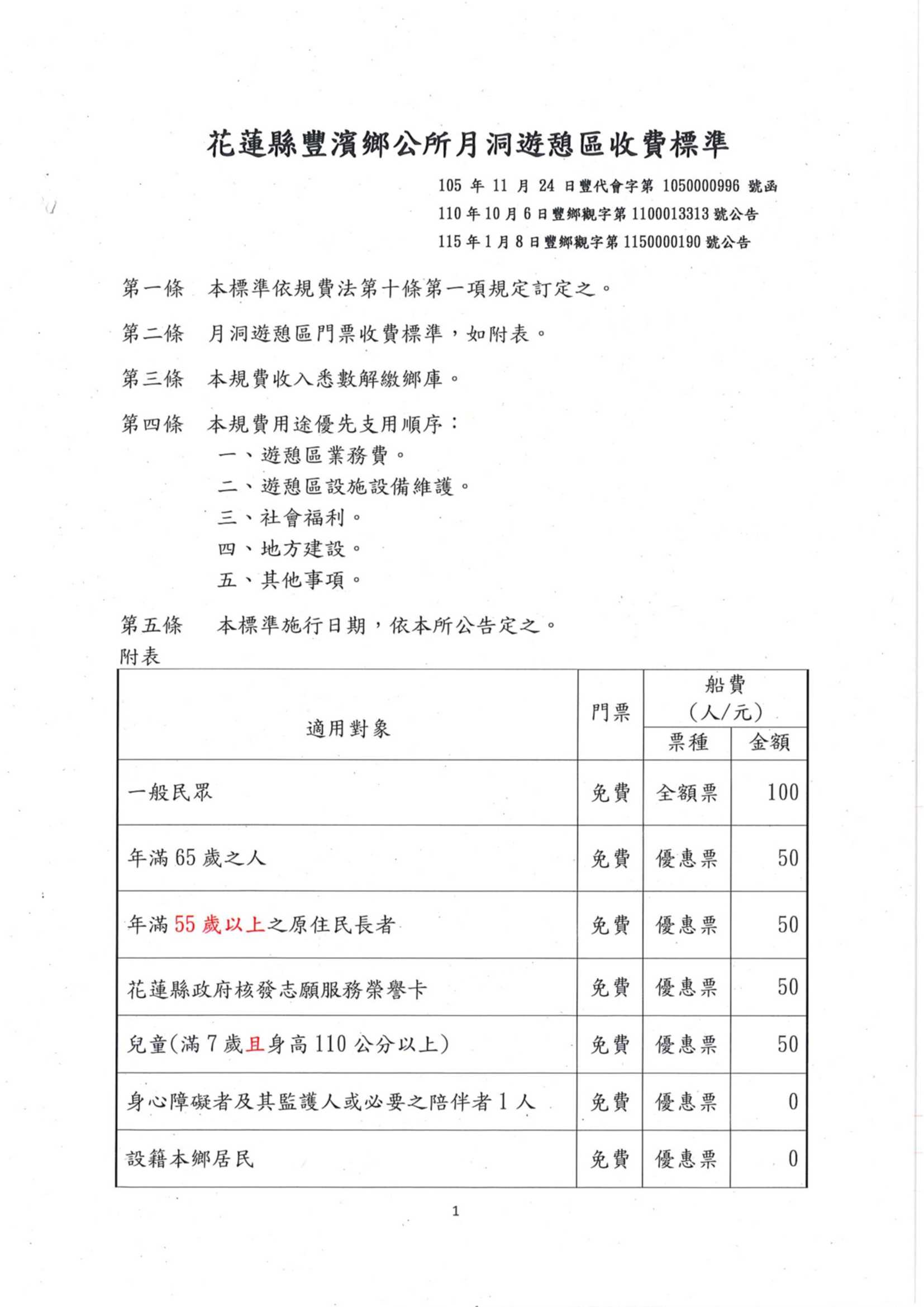 花蓮縣豐濱鄉公所公告修訂後之「花蓮縣豐濱鄉公所月洞遊憩區收費標準」(.pdf)
