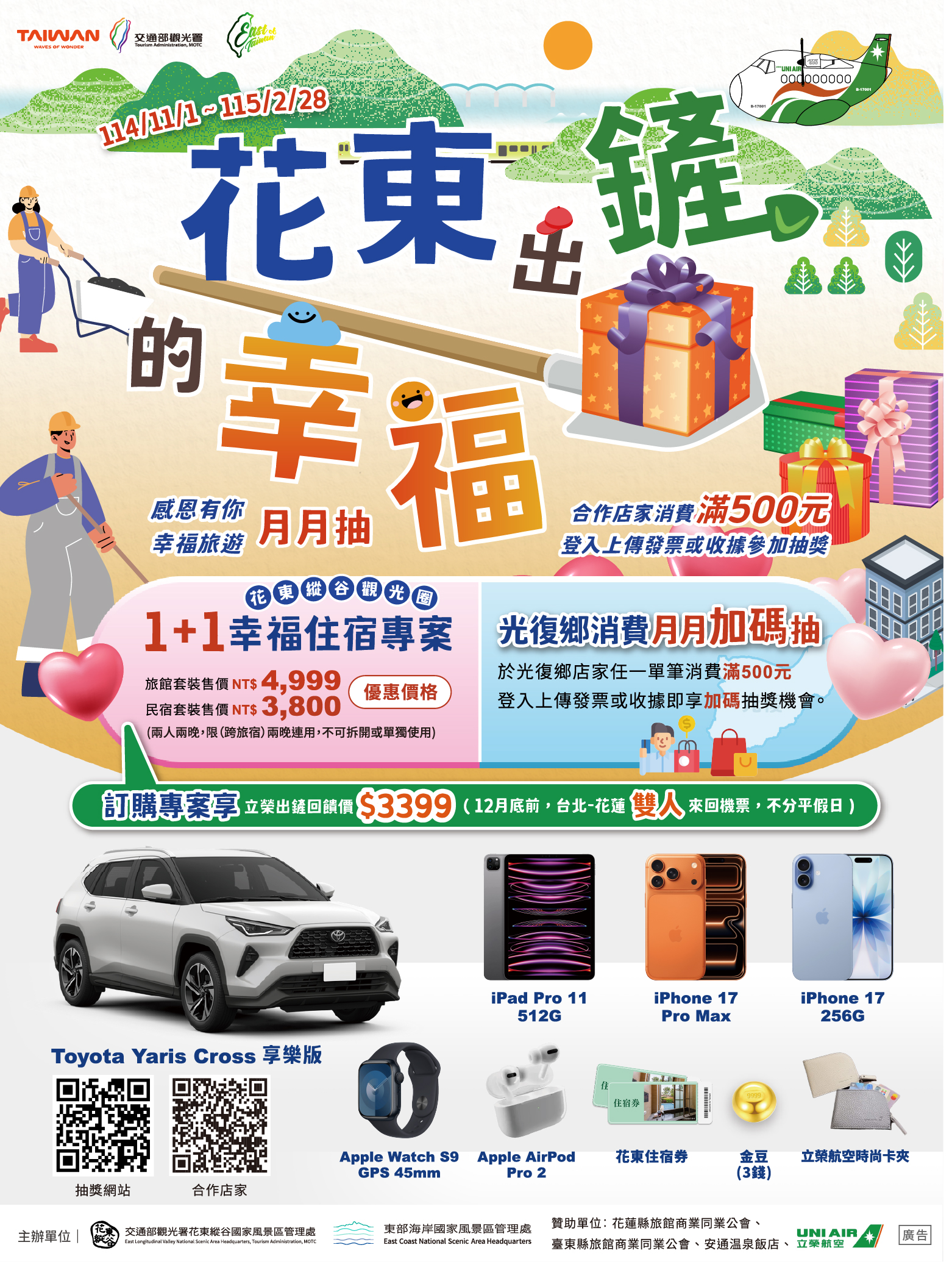 縱管處目前正熱烈進行多項超值優惠與抽獎活動,提供遊客於花東旅遊期間多元參與及回饋機會。其中「花東出鏟的幸福」活動,鼓勵遊客走入花東在地店家消費,只要於活動期間內前往花東合作店家消費(光復地區另有消費加碼,且不限合作店家),即可參加專屬加碼抽獎,獎項包含 Toyota Yaris Cross 汽車、iPhone17 Pro Max、金豆及東京來回機票等豐富好禮。