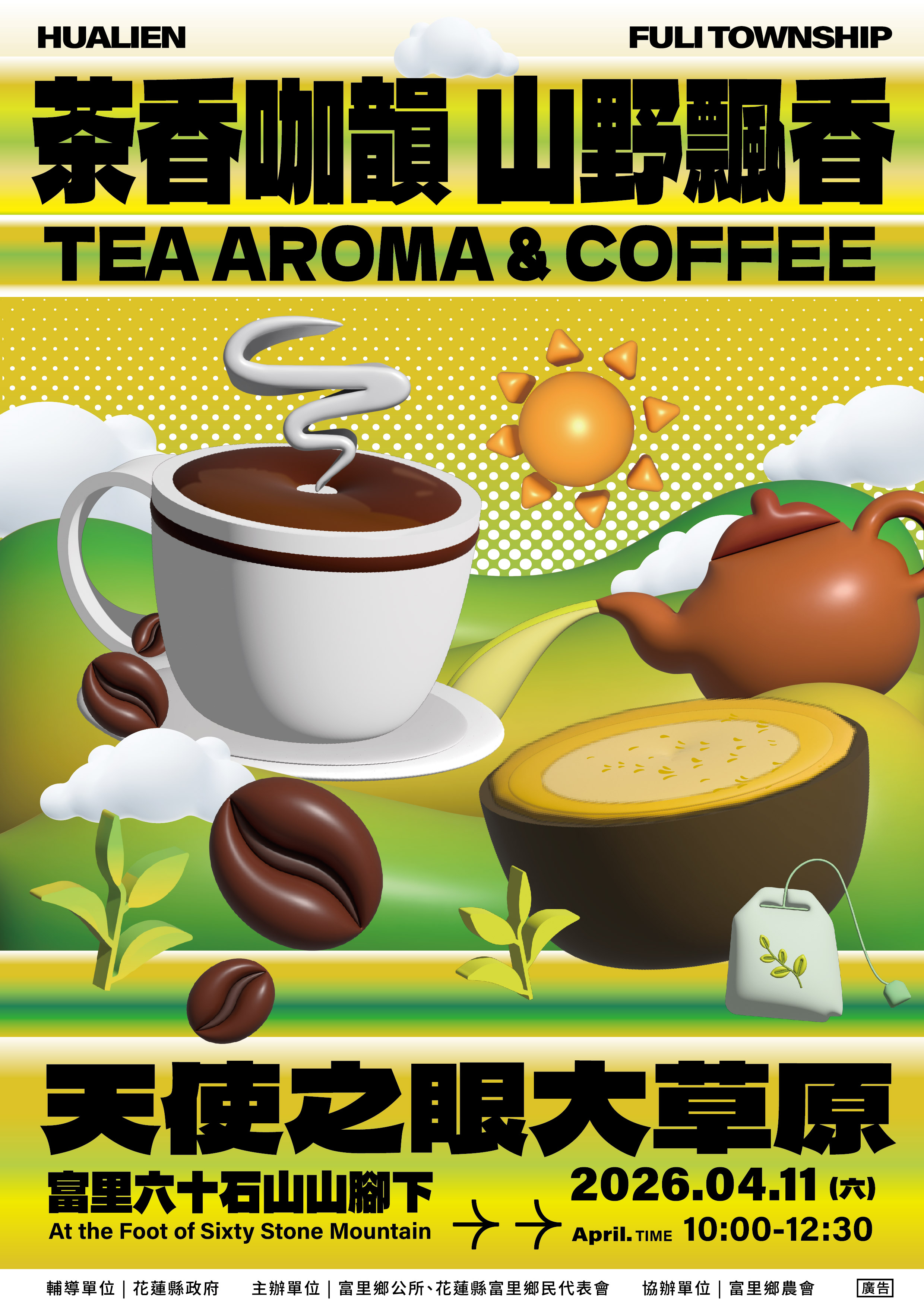 訊息內容花蓮縣富里鄉公所辦理2026第三屆「茶香咖韻.山野飄香」活動,活動資訊如下:時間:2026年4月11日(星期六)上午10時至下午12時30分。地點:天使之眼大草原(富里六十石山山腳下,台九線293K往六十石山入口進入,直行約900公尺處)。活動內容:在地茶與咖啡品飲、音樂演出。費用:全程免費(無需報名)。附件檔案2026第三屆「茶香咖韻.山野飄香」活動DM(.pdf)相關連結富里鄉公所Facebook粉絲專頁富里鄉公所官網相關照片