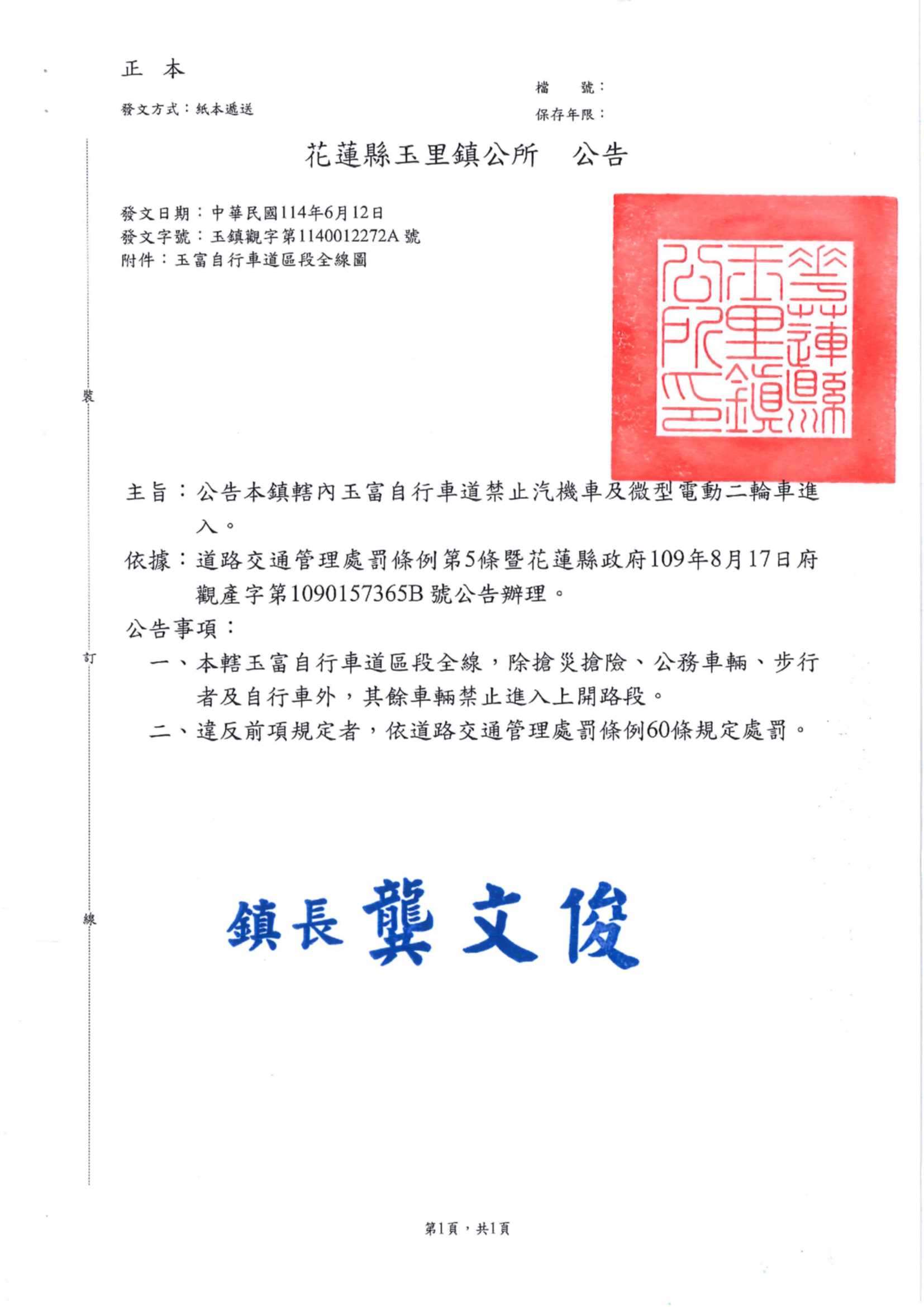 花蓮縣玉里鎮公所 公告|玉鎮觀字第1140012272A號 玉富自行車道(.pdf)