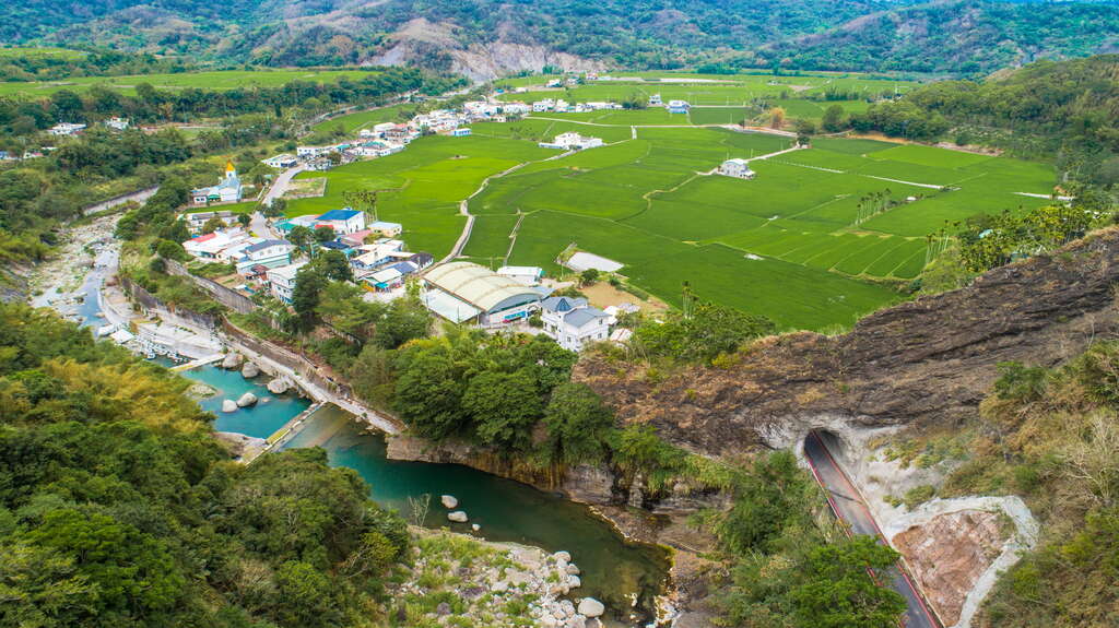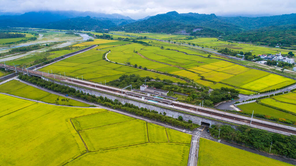 遠眺被綠、黃漸層色的阡陌稻田圍繞的東里車站