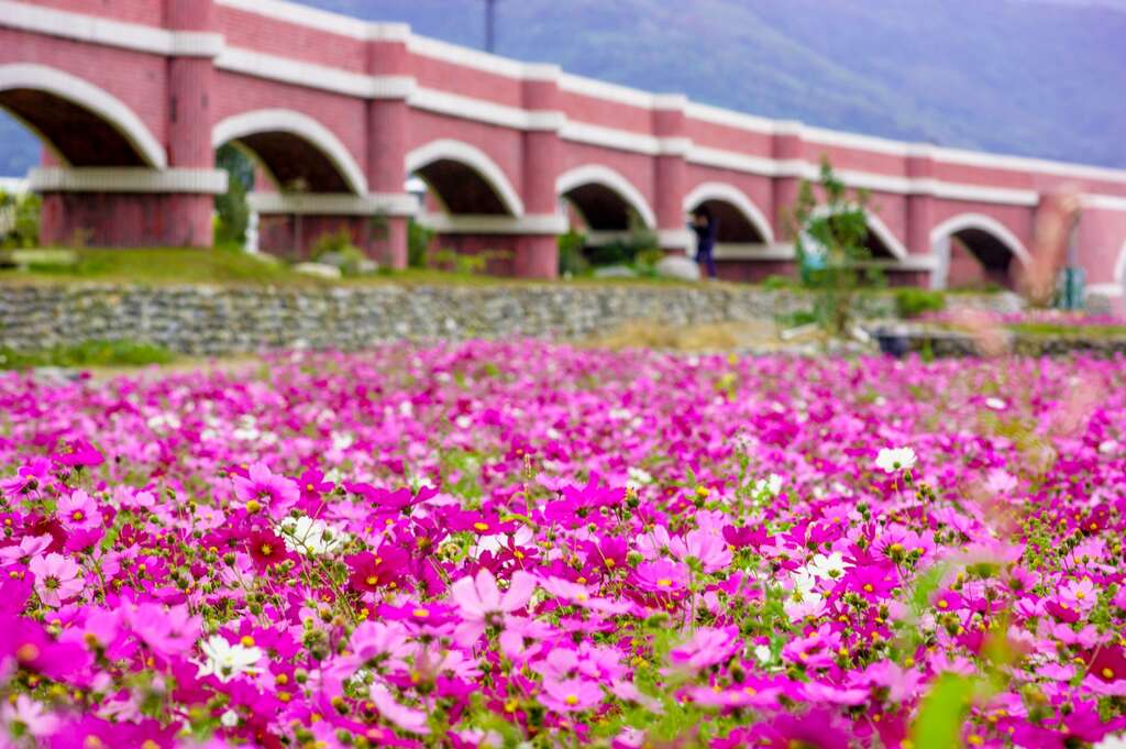 二層坪水橋是全台罕見的浮圳,配合其仿糯米橋型式建築、大面積完整梯田、河岸地形及惡地景觀,讓這個存在已久的農業設施更是獨一無二。冬季休耕期大片波斯菊花海更是將水橋映襯得美輪美奐,春節期間歡迎大家攜家帶眷來二層坪與絕美的水橋、可愛的藝術裝置合影,逛逛在地市集、聽聽音樂,用好心情為新的年度開啟篇章。(停留約20分鐘)